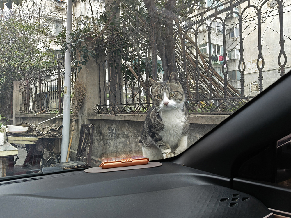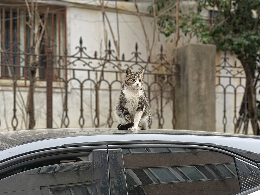 几分钟后,我开门下车,忽然发现这只喵就蹲在车顶,正好俯视着下车的我,人喵对视,略有尴尬^_^